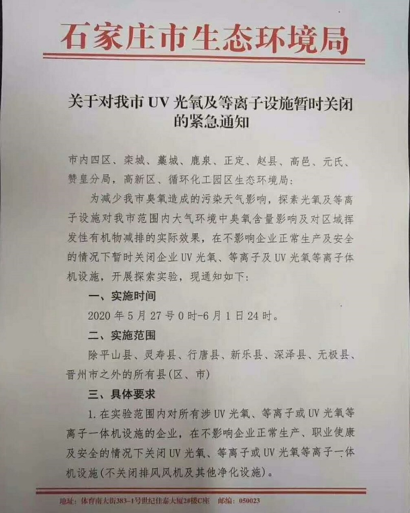 近日,一份河北石家莊市生態(tài)環(huán)境局的文件引起了廣泛流傳,主要內(nèi)容為:為探索光氧及等離子VOCs治理設(shè)施對(duì)石家莊大氣環(huán)境中臭氧含量影響就對(duì)應(yīng)區(qū)域VOCs減排實(shí)際效果,在不影響企業(yè)正常生產(chǎn)及安全的情況下暫時(shí)關(guān)閉企業(yè)UV光氧、等離子及UV光氧等離子體機(jī)設(shè)施(但不關(guān)閉排風(fēng)風(fēng)機(jī)及其它凈化措施),開(kāi)展探索實(shí)驗(yàn)。實(shí)施時(shí)間為:5月27日0時(shí)到6月1日24時(shí)!