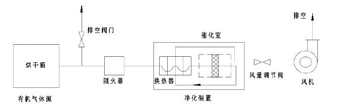 該裝置主體結(jié)構(gòu)由凈化裝置主機(jī)、引風(fēng)機(jī)、控制系統(tǒng)三大部分組成。其中凈化裝置包括:除塵阻火器、熱交換器、預(yù)熱器、催化燃燒室。
