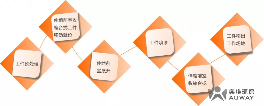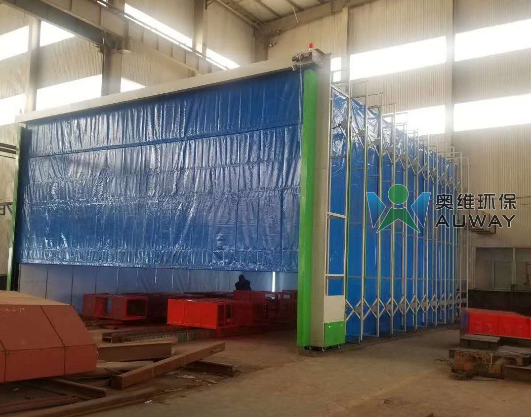 移動式噴漆伸縮房是配合除塵設備和廢氣處理設備使用的一種大型環(huán)保設備。主要用于體積大、重量重的工件的噴漆和打磨。伸縮房收攏時,將產(chǎn)品用行車移動至伸縮房伸縮范圍的適當位置,開走行車,將伸縮房伸展開來,在伸縮房內(nèi)進行噴漆作業(yè)。作業(yè)完成后,收攏伸縮房,將噴漆后的產(chǎn)品使用行車挪走。伸縮房的使用,使工作場地的使用更科學合理。