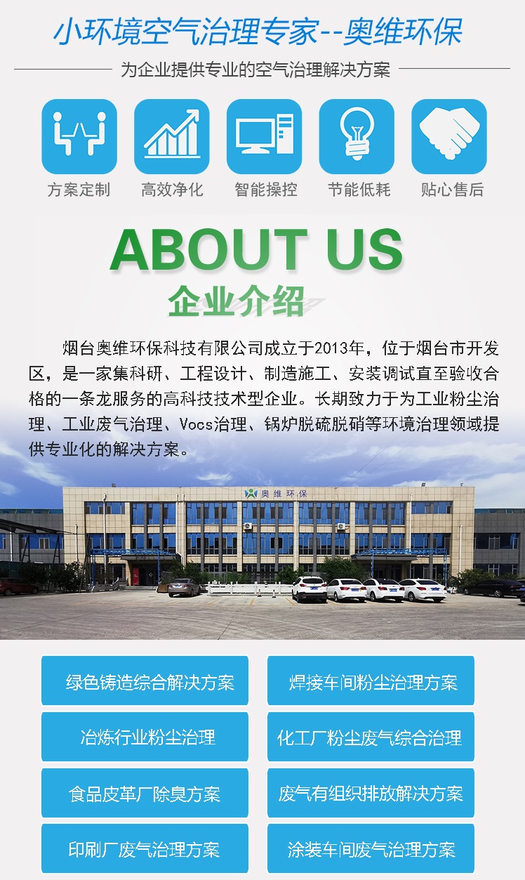 煙臺(tái)奧維環(huán)保科技有限公司成立于2013年,位于煙臺(tái)市開發(fā)區(qū),是一家集科研、工程設(shè)計(jì)、制造施工、安裝調(diào)試直至驗(yàn)收合格的一條龍服務(wù)的高科技技術(shù)型企業(yè)。長期致力于為工業(yè)粉塵治理、工業(yè)廢氣治理、Vocs治理、鍋爐脫硫脫硝等環(huán)境治理領(lǐng)域提供專業(yè)化的解決方案。