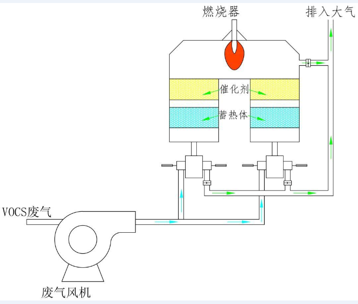 RTO(Regenerative Thermal Oxidizer)蓄熱燃燒系統(tǒng),主要由蓄熱室、燃燒室、氣流切換閥組成。蓄熱室內(nèi)裝滿陶瓷蓄熱體,燃燒室裝一個(gè)帶比例調(diào)節(jié)的燃燒器。共設(shè)有預(yù)吹掃、點(diǎn)火、升溫、焚化、保溫、后吹掃停機(jī)6 種狀態(tài)。